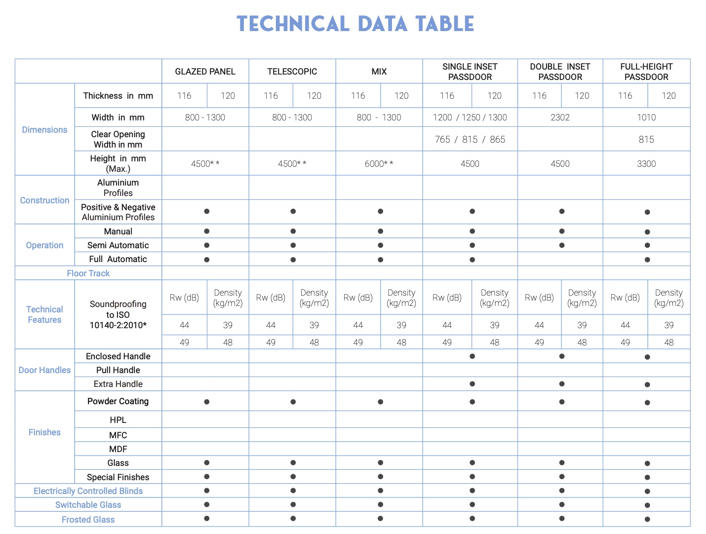 Alnoaqua, birçok panel tipinde üretilebilir. Bu sayede hem düz hem kavisli mimariye, hem de yüksek geçiş alanı gerektiren projelere mükemmel uyum sağlar. 4500 mm ve 6000 mm’ye kadar panel yüksekliği ile büyük ölçekli alanlarda etkileyici bir görünüm oluşturur. Manuel, yarı otomatik veya tam otomatik kullanım seçenekleriyle projeye göre kişiselleştirilebilir, ağır yük taşıyabilen tavan ray seçenekleriyle güvenlikten ödün vermez. Premium yapısı sayesinde uluslararası firmalar ve küresel kampüs projeleri tarafından tercih edilir.