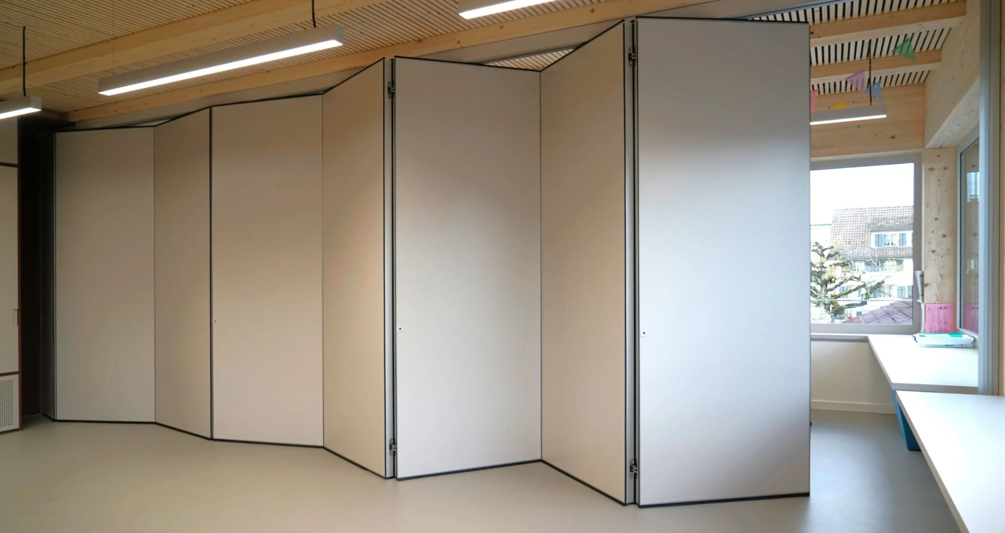 Alnowave, katlanır yapısı sayesinde hızlı açılıp kapanabilir; alanlar tek dokunuşla toplantı odasına, eğitim sınıfına veya geniş bir sosyal alana dönüşebilir. “One Wall, Several Spaces” yaklaşımıyla mekân verimliliğini en üst seviyeye çıkarır.